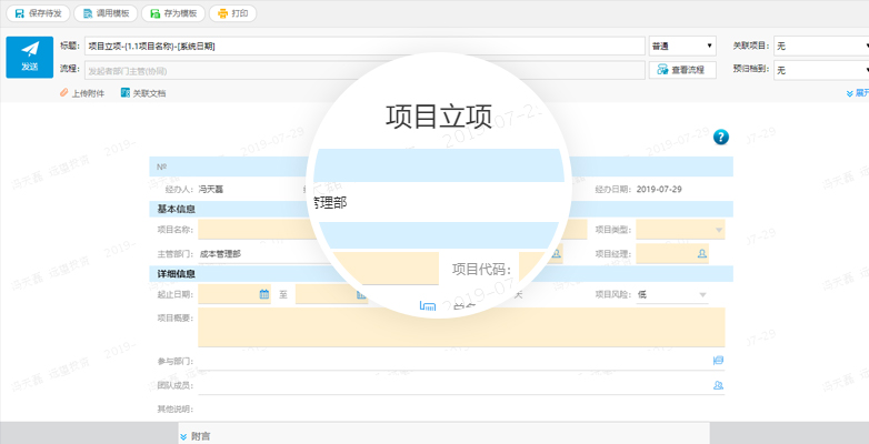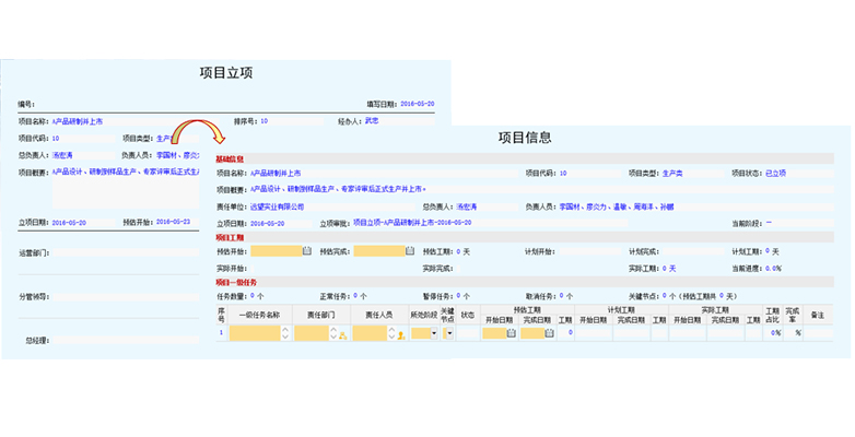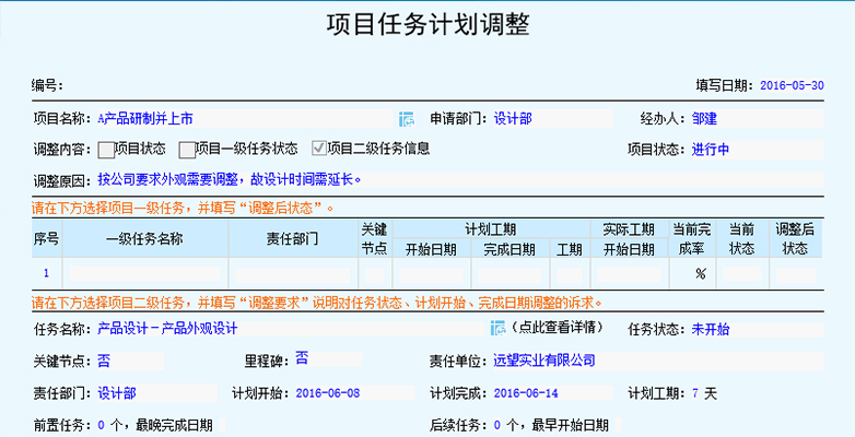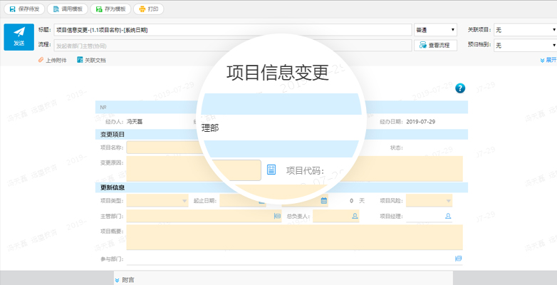 填寫變更信息的內(nèi)容后,經(jīng)相關(guān)部門及管理者審批后,系統(tǒng)自動更新項目信息。