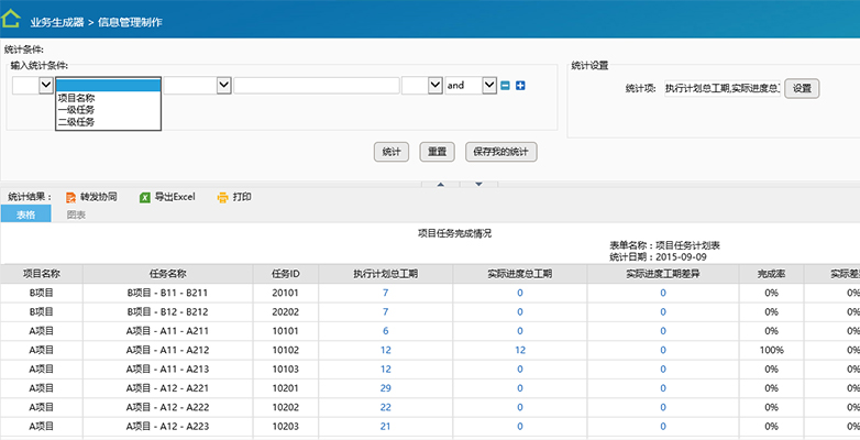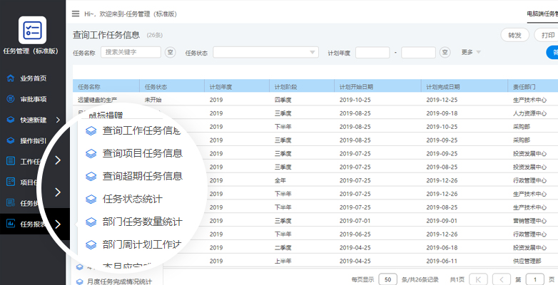 支持任務(wù)管理相關(guān)信息的查詢和報表統(tǒng)計,可根據(jù)實際需要調(diào)整修改。