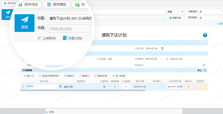 采購部門可發(fā)起采購申請、采購計劃,并生成請購檔案、采購計劃檔案。