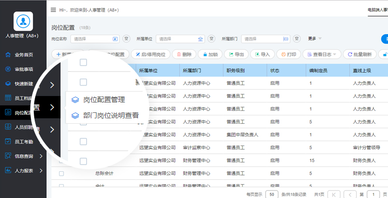 支持對單位、部門等崗位的配置定編審批,員工可查看部門崗位說明。