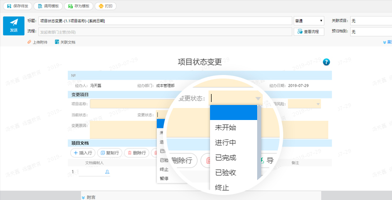 根據(jù)要求填寫變更后的狀態(tài)和變更原因,經(jīng)相關(guān)部門及管理者審批后,系統(tǒng)自動更新項目狀態(tài)。