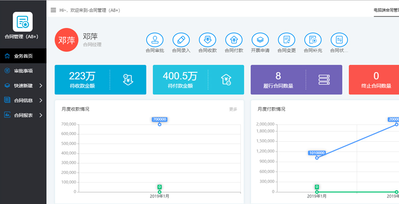 支持自定義常用功能入口;快速掌握合同管理的相關(guān)信息,并以圖表形式呈現(xiàn)。