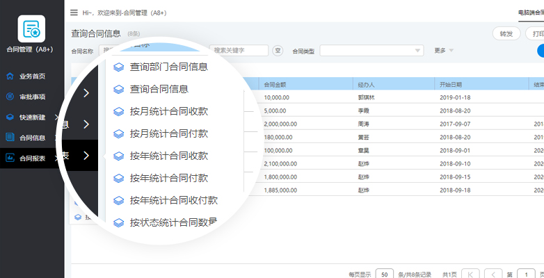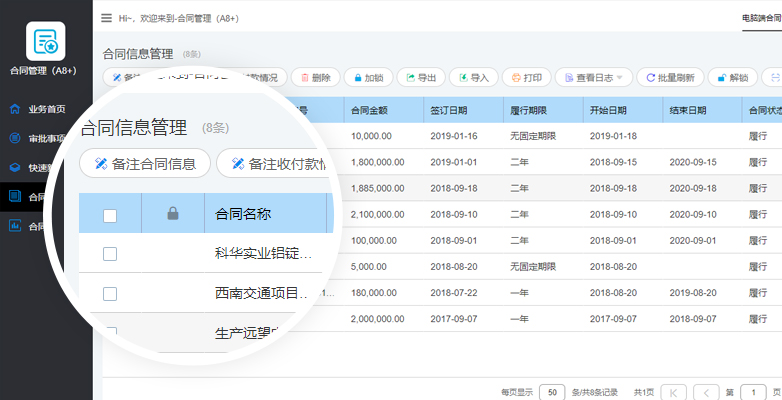 支持合同的錄入、審批,并生成合同檔案,便于查詢和管理經(jīng)手合同。