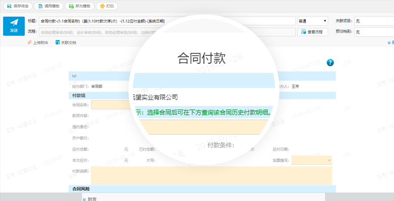 支持錄入合同的收付款信息,并發(fā)起審批流程。